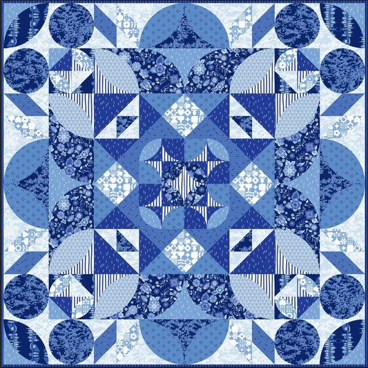 OverzichtHet complete stoffenpakket voor het maken van de quilttop en binding van het patroon Bloem.